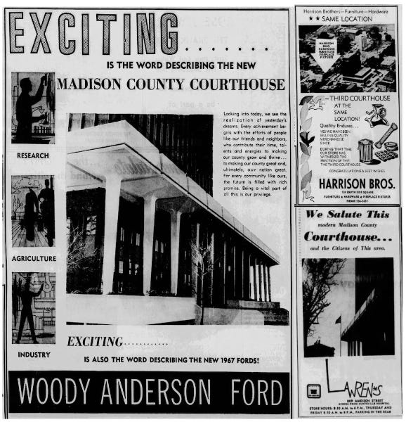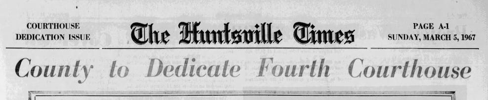 The March 5, 1967 issue of The Huntsville Times was dubbed “the Courthouse Dedication Issue,” and a large section was devoted to the hotly anticipated opening of the courthouse, with ads from all kinds of local businesses wanting to join in on the excitement. The city’s residents thronged to see it when it first opened.