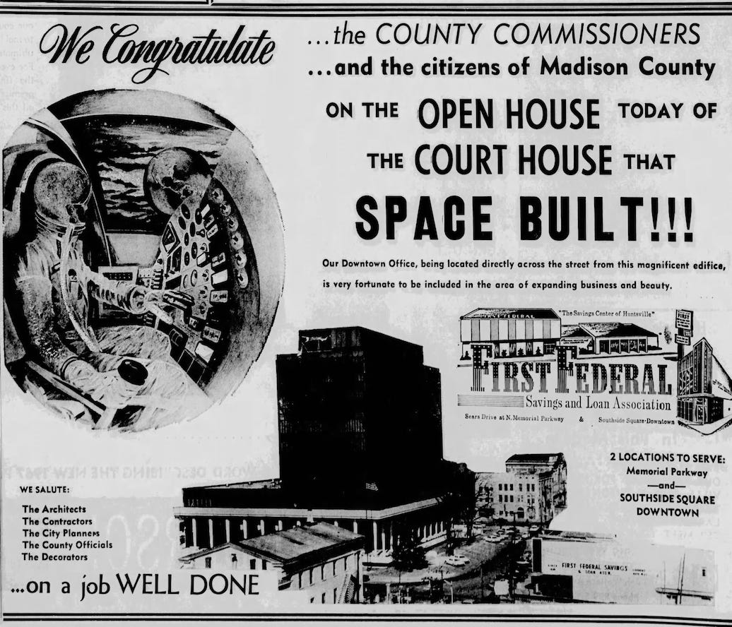 The courthouse and I both debuted in the mid-1960s, amid the energy and exhilaration of the space program. My parents even met at Marshall Space Flight Center, where they worked during their college years. And the courthouse was planned and designed to reflect our area’s role in the amazing Space Age.